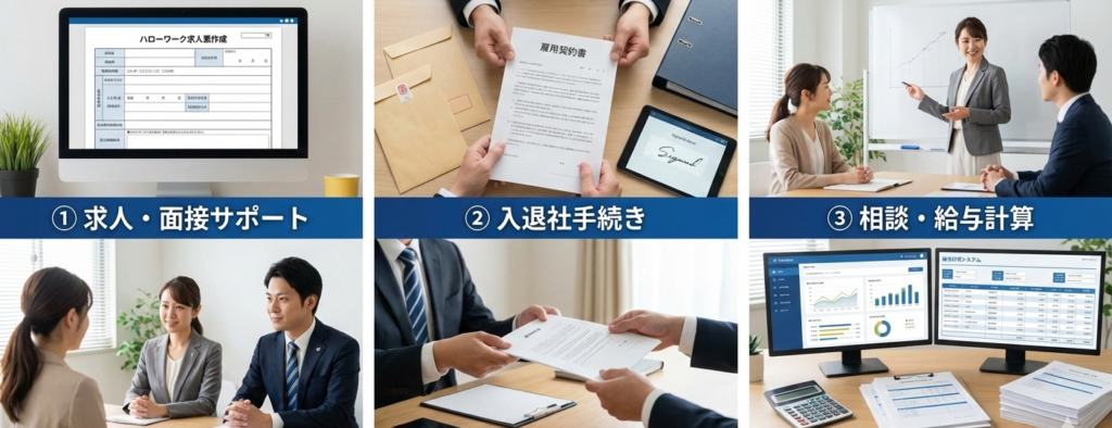 ▶求人票作成、入退社の書類作成や書類回収、毎月の給与計算まですべてを事務代行させていただきます。